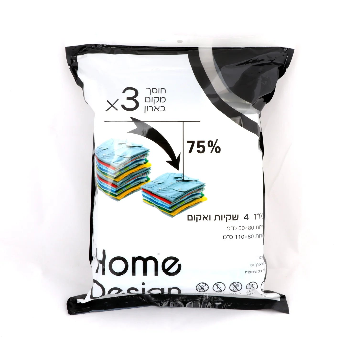 ט 4 שקיות ואקום רב-פעמיות – לאחסון והגנה מושלמים שדרגו את פתרונות האחסון שלכם עם סט שקיות ואקום חזקות ועמידות, המספקות הגנה מושלמת על הבגדים, המצעים, או החפצים האישיים שלכם לאורך זמן. ✔️ שימוש רב-פעמי: שקיות איכותיות ועמידות המאפשרות שימוש חוזר לאורך זמן. ✔️ אחסון חכם: מתאים לצמצום נפח האחסון של בגדים, שמיכות, כריות ועוד. ✔️ הגנה מלאה: מגן מפני לחות, אבק וריחות לא נעימים. ✔️ גדלים מגוונים: הסט כולל: 2 שקיות בגודל 80×110 ס"מ 2 שקיות בגודל 60×80 ס"מ פתרון אידיאלי לארגון וסדר בביתכם – הזמינו עכשיו ותיהנו מאחסון חכם, קל ויעיל!